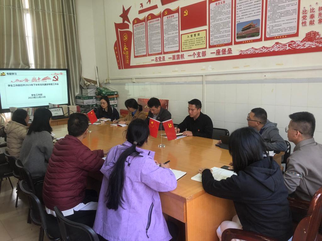 为进一步落实全面从严治党要求,强化学校党风廉政建设主体责任,推进“校园廉洁文化”建设,11月11日,学生工作部组织召开2023年下半年党风廉政建工作计划和工作部署会议,学生工作部全体教职工参会。