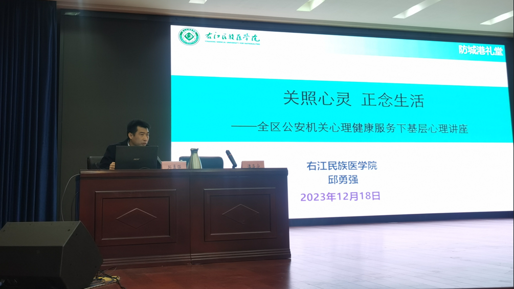 12月19日,百色市心理服务团体分别到防城港市附城派出所和港城派出所开展心理团辅活动。通过开展“我来了”“压力感受”“同舟共济”等活动,邱教授从心理学角度对如何调解群众纠纷提供专业建议。12月20日上午,防城港市公安局举办主题为“关照心灵,正念生活”的心理讲座,邱勇强教授围绕“警惕身体亚健康信号 适时做出认知调整”等方面内容,帮助民辅警如何学会用心理学知识关注身体健康和心理健康,学会珍惜当下、享受生活。讲座结束后,百色市和防城港市两地公安机关心理服务团队骨干召开学习交流座谈会,就如何更好的服务有心理困扰的民辅警、提高公安机关心理健康服务团队整体水平、将心理健康服务工作与党建工作相结合等问题展开热烈的讨论。本次心理健康服务下基层活动开展专题讲座1次,并以电视电话形式覆盖到6个分县(市)局、56个基层科所队509余人参加,心理骨干座谈交流会1场18人参加,心理团辅活动2场40余人参加,个案咨询2人。