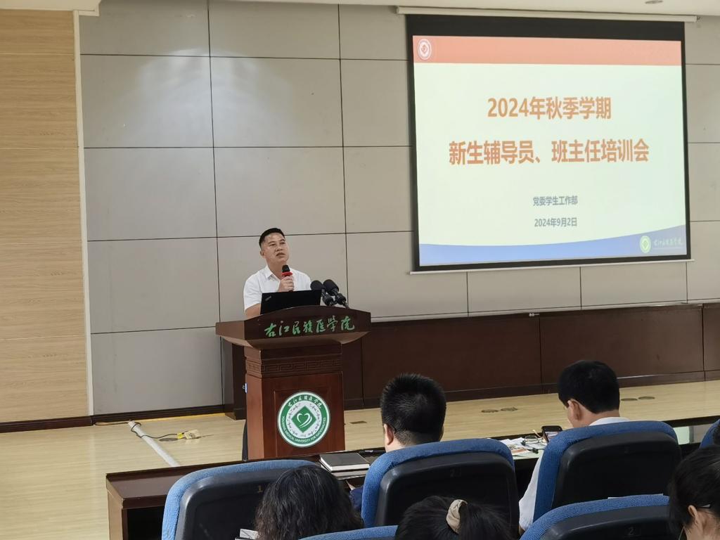 为加强辅导员、班主任队伍建设,提升大学生思想政治教育和学生日常管理工作能力,学生工作处于2024年9月2日召开2024年秋季学期新生辅导员、班主任培训会。学生工作处全体成员,各学院学生科科长、2024级新生辅导员、班主任及2024年新入职辅导员参加培训会。
