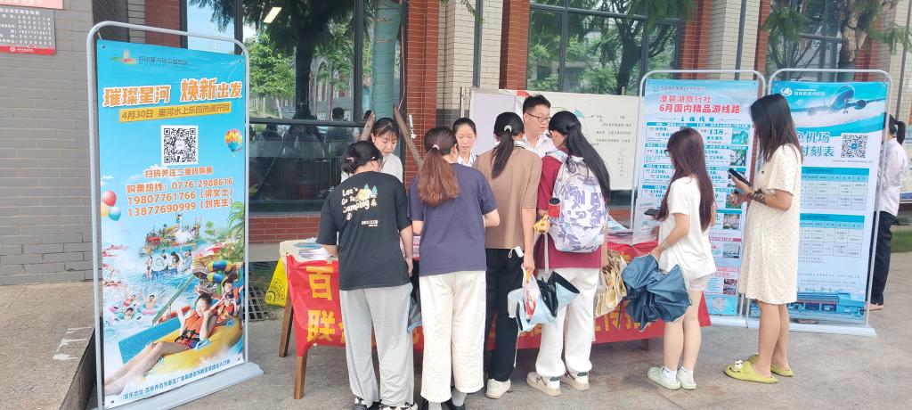 活动现场,百色文旅与百色机场的工作人员通过展板、宣传册及现场讲解,向同学们详细介绍了暑期旅游线路、航线优惠政策及本地景区特色产品。