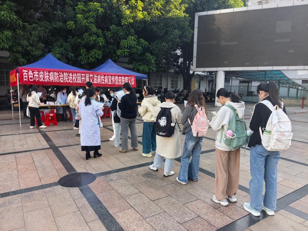 活动现场设置了知识宣传区、专家咨询区与免费义诊区两大功能区域。在知识宣传区,百色市皮肤病防治院的工作人员通过摆放宣传页、发放科普手册等形式,向过往学生详细讲解艾滋病的传播途径、预防措施以及国家相关防治政策,帮助学生们消除对艾滋病的误解与恐慌。专家咨询与免费义诊区,医护人员耐心接待每一位前来咨询的同学,针对他们提出的关于艾滋病、性病及常见皮肤病的问题进行专业解答,并提供个性化的健康指导建议。