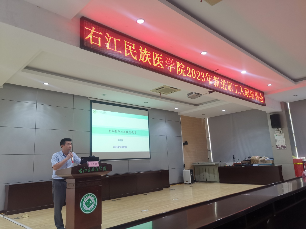 为帮助必威西汉姆联官网新职工尽快适应工作,10月15日,右江民族医学院2023年新进职工入职培训在5栋101学术报告厅举行。学生工作部副部长邱勇强教授就青年教师心理健康教育专题进行授课。课程围绕青年教师的压力源、压力应对模式及心理调适等进行了专业辅导。