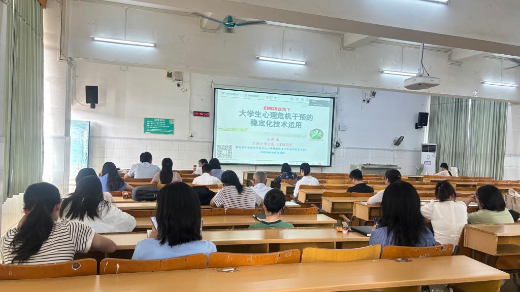 本次培训邀请东南大学应用心理研究所所长马向真教授主讲。上午,马教授以《大学生心理危机干预的稳定化技术运用》为题,从EMDR视角系统阐述了心理稳定化技术的治疗过程、核心作用成分,以及该技术在学生心理危机干预、心理创伤解决中的具体应用方法。下午的《大学生心理危机干预的伦理》课程中,她围绕如何识别危机警报的具体内容与行为表现;实际个案干预中涉及的伦理议题;危机评估及危机干预流程的精细化实施等方面展开。