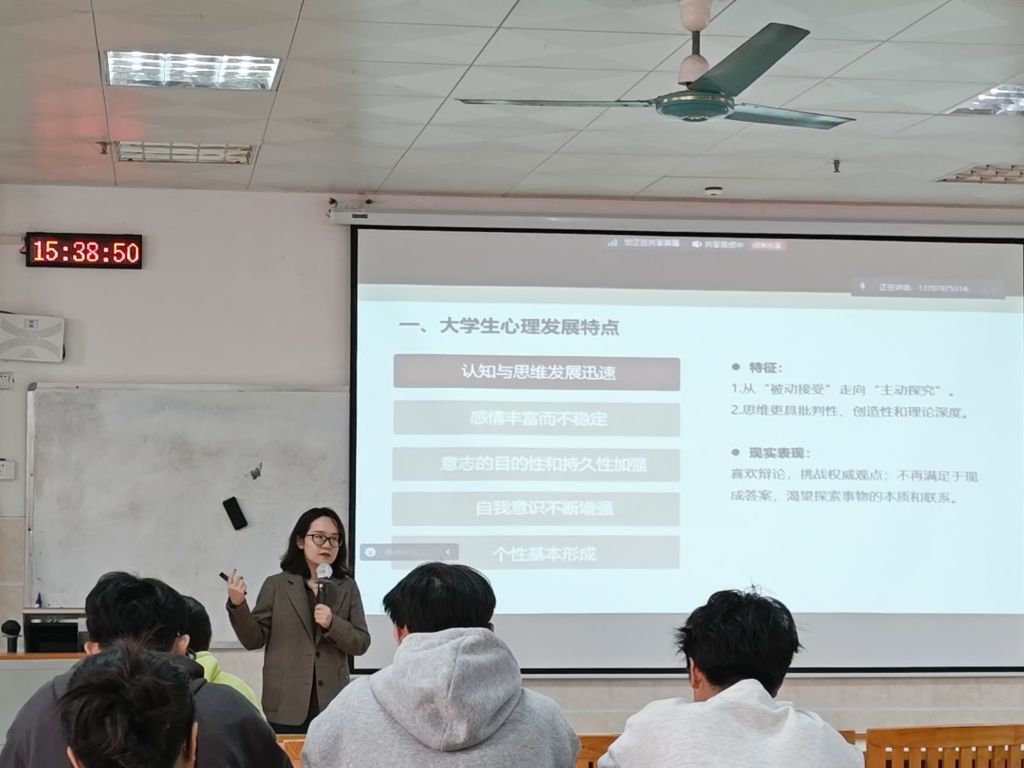 本次讲座聚集大学生成长核心需求,邀请国家三级心理师,大学生心理健康教研室林泉老师。林老师围绕大学生三大核心心理特点——认知思维从被动接受转向主动探究、情感体验丰富且易波动、意志品质与自我意识逐步增强,分享了生活独立、心理认同、亲密关系发展、学业与职业规划四大心理发展任务。同时结合马斯洛需要层次理论与自我认知三维度,提供了科学的自我调节、人际沟通及自我接纳方法;针对大学生常见的“抽象”表达现象,解析了其背后缓解压力、适配时代心理需求的逻辑。此外,林老师还给出具体建议:面对问题时应采用积极应对方式;要学会接纳自己,正视自身优缺点,避免因单一归因陷入自卑,以立体视角看待自我,采用乐观归因模式。