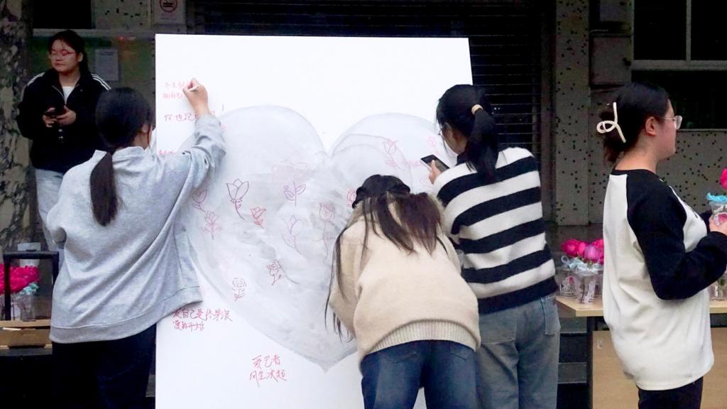 活动现场,象征情绪起点的灰色爱心油画板静置摆放,轻柔的音乐与淡雅的玫瑰芬芳交织融合,为参与者营造出安宁的疗愈氛围。在工作人员的悉心引导下,同学们将灰色爱心绘满绚烂的玫瑰,以色彩释放情绪,以笔触表达自我。每一幅作品旁,更留下了温暖的成长寄语与真诚的自我肯定。创作结束后,工作人员为每位同学送上鼓励的话语、暖心的拥抱,并赠予一支鲜妍的玫瑰。这一刻,理解、认可与关怀在无声与有声的交流中自然流淌,定格为冬日校园里一抹动人的温暖。